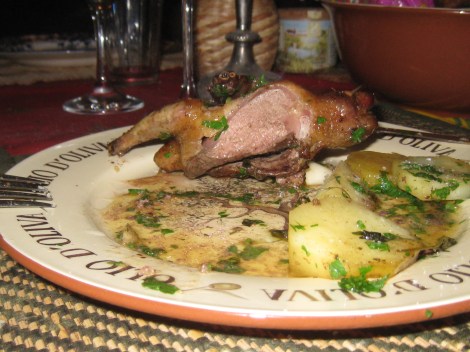 Nimelt küpsetasin ma ära paar tuvi: lõikasin pooleks, et kiiremini valmiks, maitsestasin soola-pipra ja piri-piri seguga. Praadisin tuvid õli ja või segus ja kui kui tuvid olid pruunistunud, tõstsin õhukeste kartuliviiludega (võib ka huvitavamat juurvilja, aga mul polnud paraku kodus midagi muud) kaetud pannile. Panin ahju 210 kraadisele kuumusele ja küpsetasin 15 minutit, kuni kartuliviilud olid pehmed. Tuvirind oli veel mõnusalt rosé, samas koiva ja tiivaosa polnud tooreks jäänud ja sobis hästi meie 1996 aasta Pauillaci kõrvale, mille M. sai kingituseks paar nädalat tagasi 15 aasta tööjuubeli puhul Swedbankis (minu jaoks Hansapangas). Tuvi olen Kaubamaja toidupoes müügil näinud. Soovitan soojalt- tuvil, sarnaselt hanega on punase lihaga rinnaliha ja sobib hästi väärika Bordeaux veini juurde. Need, kes eelistavad welldone küpsetusastet, neile see retsept ei sobi, siis tuleks valida madalal temperatuuril pikalt hautatud variant. See on ka põhjus, miks me Tigus hautatud tuvi varianti ainult pakume- welldone´i soovijale kuivataks me sel meetodil linnu lihtsalt ära, kuigi sama on ka pardirinnaga. Näiteks Alain Ducasse ühes raamatus on magret de canard (pardirind) retsepti alla pannud lausa rasvase kirja: pardirinna maksimum küpsetusaste on rosé. 1 tuvi maksab poes umbes 9- 10 eurot , restoranis saate 20 euro ja rohkema raha eest ainult pool tuvist, nii et on argument kodus küpsetamiseks!