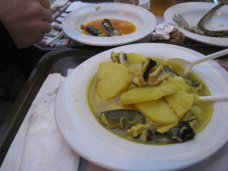 Nagu juba sai mainitud, ka Aveiro oli saabuvatele turistidele välja pannud kogu oma hiilguse: turuhoones oli angerja ja ovos moles ´i festival ja õhtul näidati kanali ääres nn. Aveiro moeshow´d. Aga, mida ma tahan eriti rõhutada, et tulime ju ka sel aastal puhkusele suure low–budget´iga ja arvestusega, et süüa teeme kodus. Tegime seda esimesed paar päeva- siis leidsime, et sel pole mõtet… Näiteks täna, kus me käisime väljas ja sõime kahe peale ühed karbid (ameijoas), grillitud kaheksajala ja pudeli veini, maksis see meile sama, mis Tallinnas osta turult üks pudel veini, üks karpkala ja salatimaterjal sinna juurde. Aveiro restoranis maksab pudel(mitte klaas) majaveini 4.50, taldrik karpe 11.50 (sel aastal on karbid väga kallid- poes maksab kilo 15 eurot ja restoraniportsus on neid ikka tublilt üle poole kilo) ja grillitud kaheksajalg 14.50 (mida nagunii ju kodus ei tee, sest pole grilli ja ei oska ka) . Kui tahate aga päris säästu eelarvel olla, lähete välja ja tellite grillitud sardiinid 8 eurot nägu ja pudel veini 4.50. Aveiro restos on aga sardiini portsud suured- jätkub ka kahepeale ühest ) Eestis ei tee kodus ka nii odavalt süüa 🙂 Kõik see jutt ei kehti muidugi Algarve, Lissaboni ja ka Porto jõeäärsete restoranide kohta, kus turistid on juba turu ära solkinud… Aga Vigos, Hispaanias, Portugali piiri ääres pidi olema lausa paradiis- Hispaaniale on see unustatud ääreala, aga samas on seal kalasadam ja mereannid pidid olema veel odavamad kui Portugalis 🙂