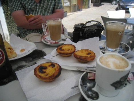 Hommikukohvi ja Pastel de Natad (Kuigi kui pilti tähelepanelikult uurida, võib näha, et üks täiuslik puhkaja on kohvi asemel endale mingi pudelis oleva vedeliku tellinud)