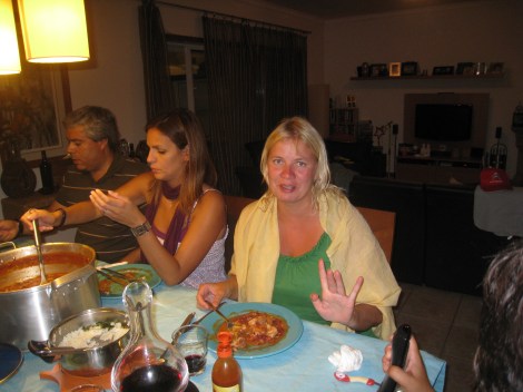 Feijoada ei ole, kui nüüd väga aus olla, sooja suveilma roog- hautis ubadest, (sea) lihast, kõrvadest, nahast etc., veel on sees tomatit, kapsast ja peaks olema ka porganidit, aga selle maja peremees ei armasta porgandit, nii et porgandit Susana ei pannud. Ja muidugi chouriço on kohustuslik tooraine. Kõik see on vürtsikas kastmes ja serveeritud riisiga- ei tundu ju suveroog 🙂 Toit on Põhja-Portugali juurtega, Susana tegi teda Tras-Os-Montese moodi ehk kasutas punaseid ubasid.