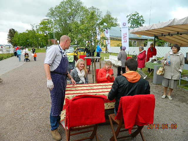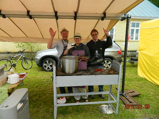 Laupäev oli aga hoopistükkis lõbusam päev. Selgus, et olime lubanud veinipäevadel toitlustamisega tegeleda ja meile oli eraldatud selleks telk Kuursaali ees. Kuna Haapsalu pealt sellist riista nagu paella pann ei õnnestud hankida, siis tuli kohale minna meie kuulsa DJ puldiga, mille taga on “grillinud” Eesti parimad diskorid. Ehk igale probleemile on lahendus. Panime oma grilli sadamakapteni lahtise kastiga jeepi ja viisime linnaplatsile, supi keetsime “kodus” valmis ja hoidsime teda grilli peal soojas. Kõrval aga grillisme merguez vorste.