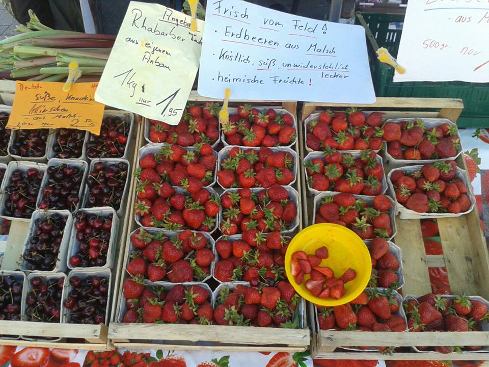Kuna teemaks oli maasikas, siis tegin täna spetsiaalselt tiiru Karlsruhes ja panin kirja maasika ja mureli hinnad. Mureli hooaeg on algusjärjes ja praegu võib leida lettidelt ka Türgi ja Itaalia odavat murelit. Maasikas on eranditult Saksamaa oma ja hind varieerus 1.98 kilo Lidl- is kuni 8 eurot kilo Füllhornis, mis on Bio märgistusega toodete kaubanduskett.
