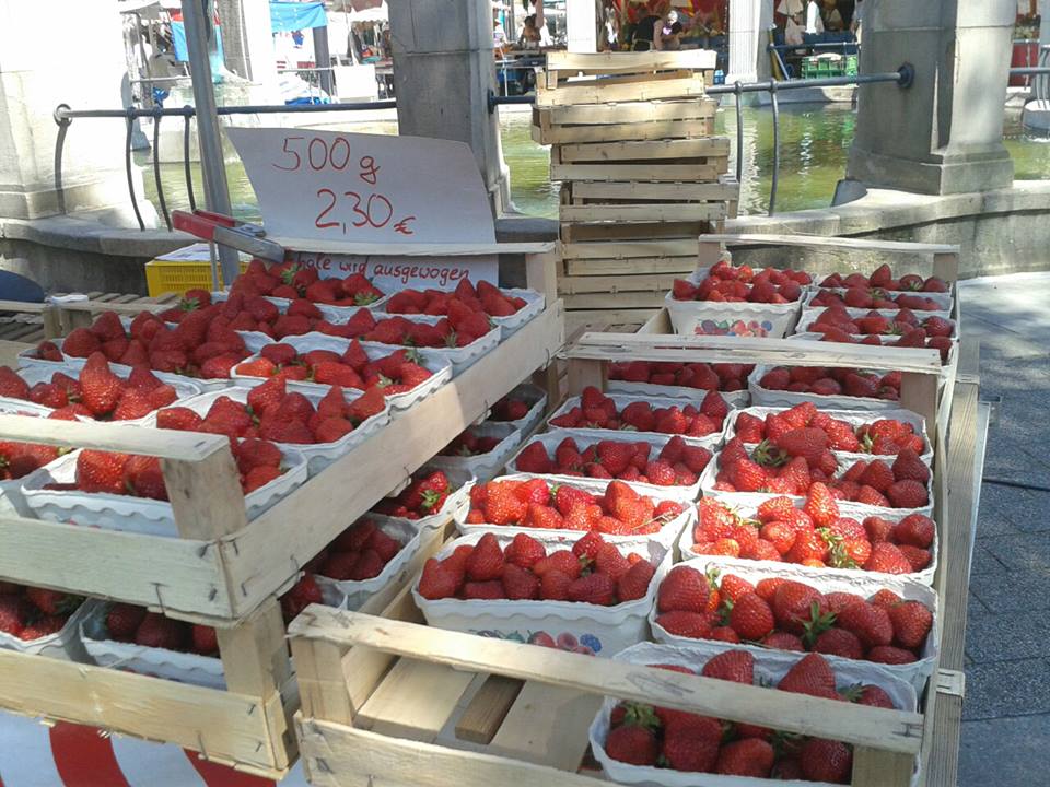 Kronenplatzi turg: odavaim maasikas 3.50 ja kalleim 7.90, Murelid alates 7 euro ja kallimad 12.00 kilo