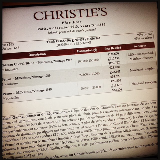 Selle aasta detsembri algul müüdi Christies oksjonil 1947 aasta Cheval Blanc maha hinnaga 131600 eurot.