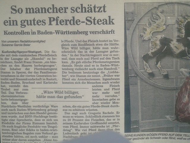 Rääkisin oma murest U-le ja tema teadis, et Karlsruhes on olemas lihunik, kes tegeleb hobuselihaga- ta oli näinud kohalikust Badeni TV-st saadet, kus pikemalt oli räägitud hobuselihast ja räägiti kust tooraine pärit. Ei mingit Rumeenia sügavkülmutatud antibiootikume täis odav liha- kõik tuleb meie regioonist.