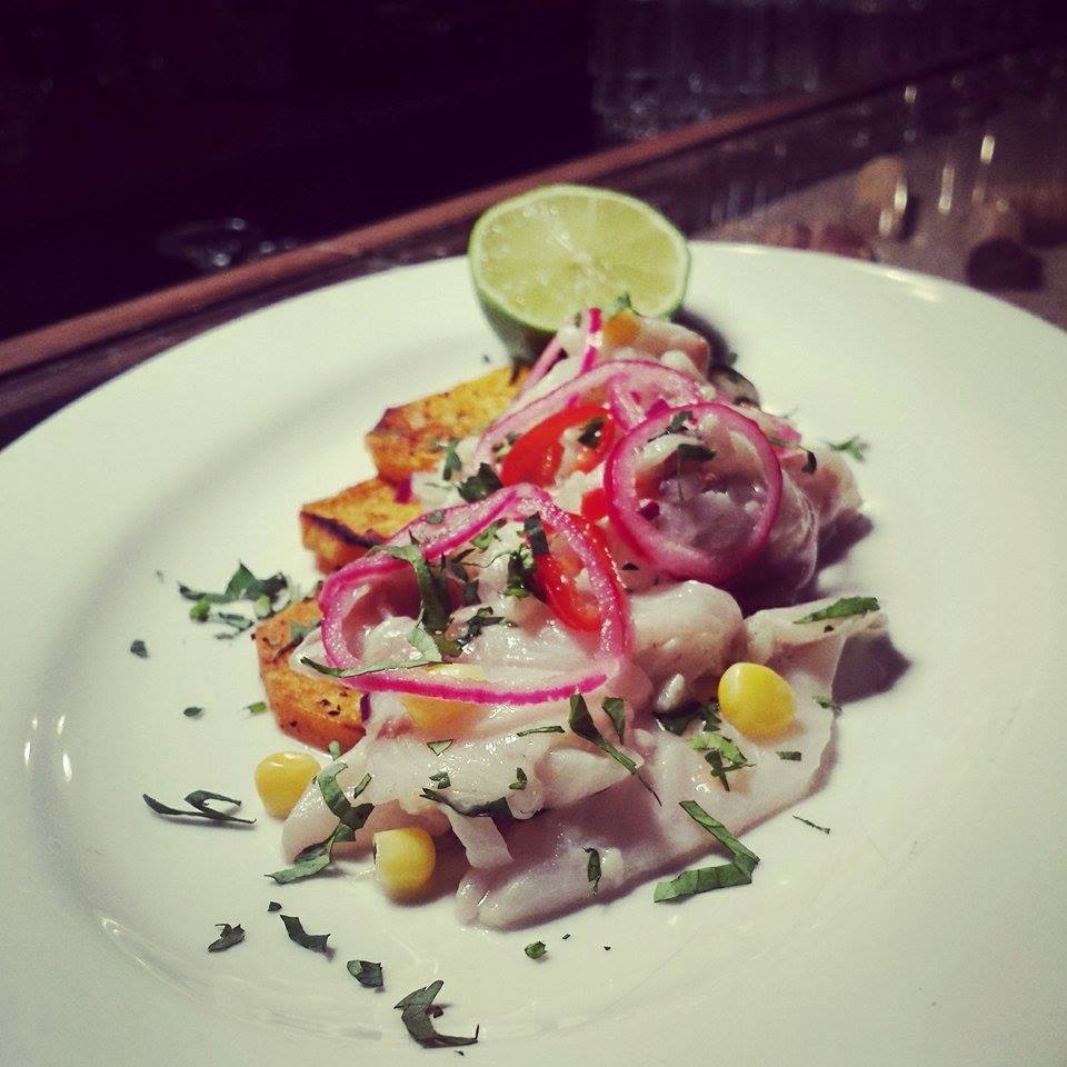 Huntahvena ceviche maisi, marineeritud sibula ja ahjubataadiga