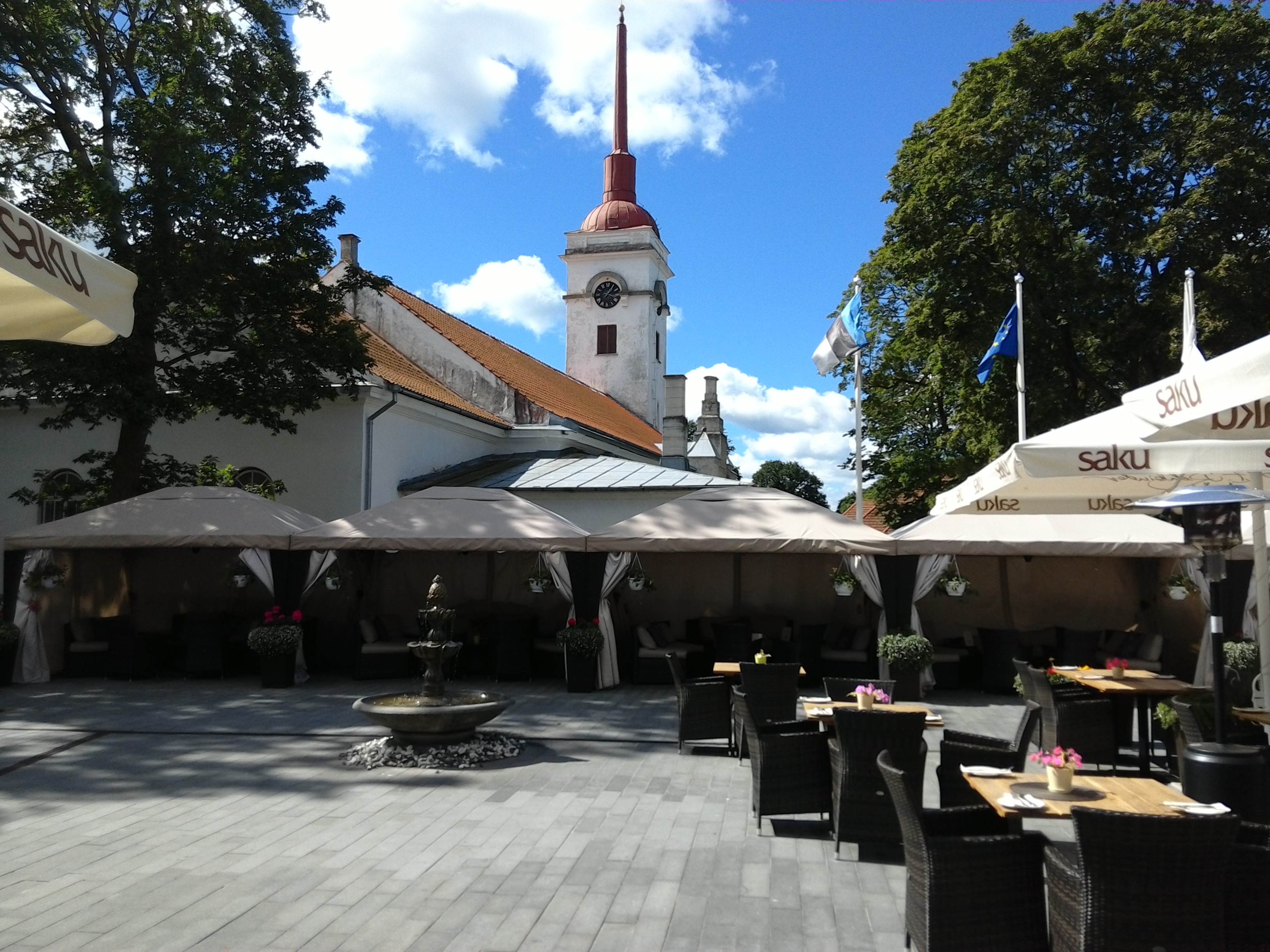 Mulle tõesti meeldib siinne terrass. Taamal väike kirikukene, ilusa ilmaga tundub nagu oleks kuskil Portugalis või Kreekas. On investeeritud õigetesse asjadesse-lauad ei logise, vihma korral saab olla telgis ja kui päike lagipähe paistab on, on korralikud päevavarjud. Külmade õhtute jaoks on gaasisoojendid. Ei ole pidevalt mööbliga tuppa-õue jooksmist kui vihma sadama hakkab või lauaga varjulise koha otsimist, kui päike lagipähe paistab.