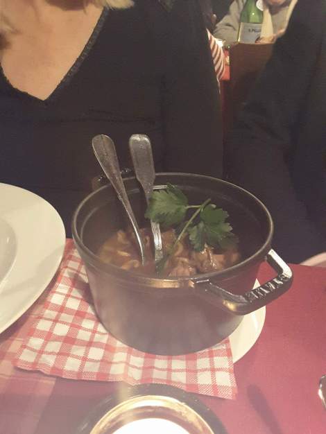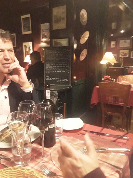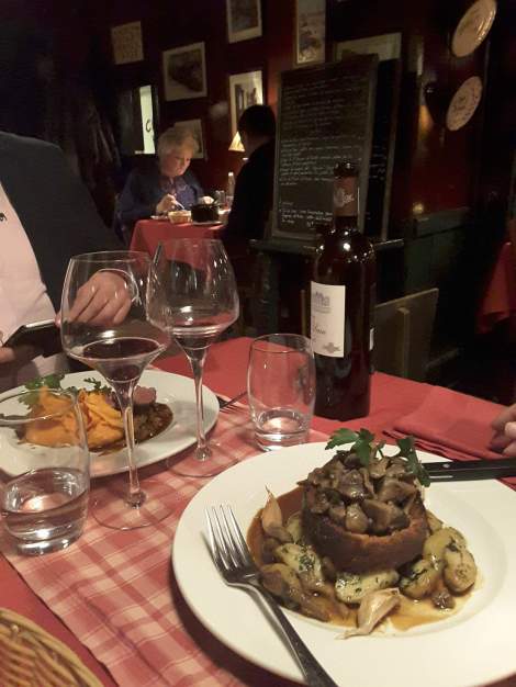 Mis häiris? Tegelikult vaid 1 asi. Ettekandjaid-kelnereid oli kogu täis saali peale vaid 3 ja nad said suurepäraselt hakkama. Kuid tugevalt häiris veini serveerimine- tellisime 2012 aasta Pauillac’i ja kelner tõi meile küll korralikud veiniklaasid, kuid avas pudeli ja lahkus lauast ilma, et oleks veini testimiseks välja kallanud. Hämmastas ka see, et noored teenindajad ei osanud ei saksa ega inglise keelt. See, et Strasbourgis noored enam saksa keelt ei räägi, hämmastas muidugi mu sakslastest sõpru. Nemad on sellega harjunud, et nendega oma keeles räägitakse. Mina muidugi ei arva, et prantslased peaksid saksa keelt rääkima, kuigi eks ta kasuks tuleks. See on nagu meil Tallinnas hakkab soome keele oskus teenindajatel kaduma. Meil polnud probleeme, sest me Claudiaga tönkame mõlemad prantsust. Kulme aga pani kergitama kui meid teenindanud noormees jäi kõrvallauda teenindades ka inglise keelega jänni. Aga tõesti, see keele oskamatus ei häirinud, vaid pani imestama.