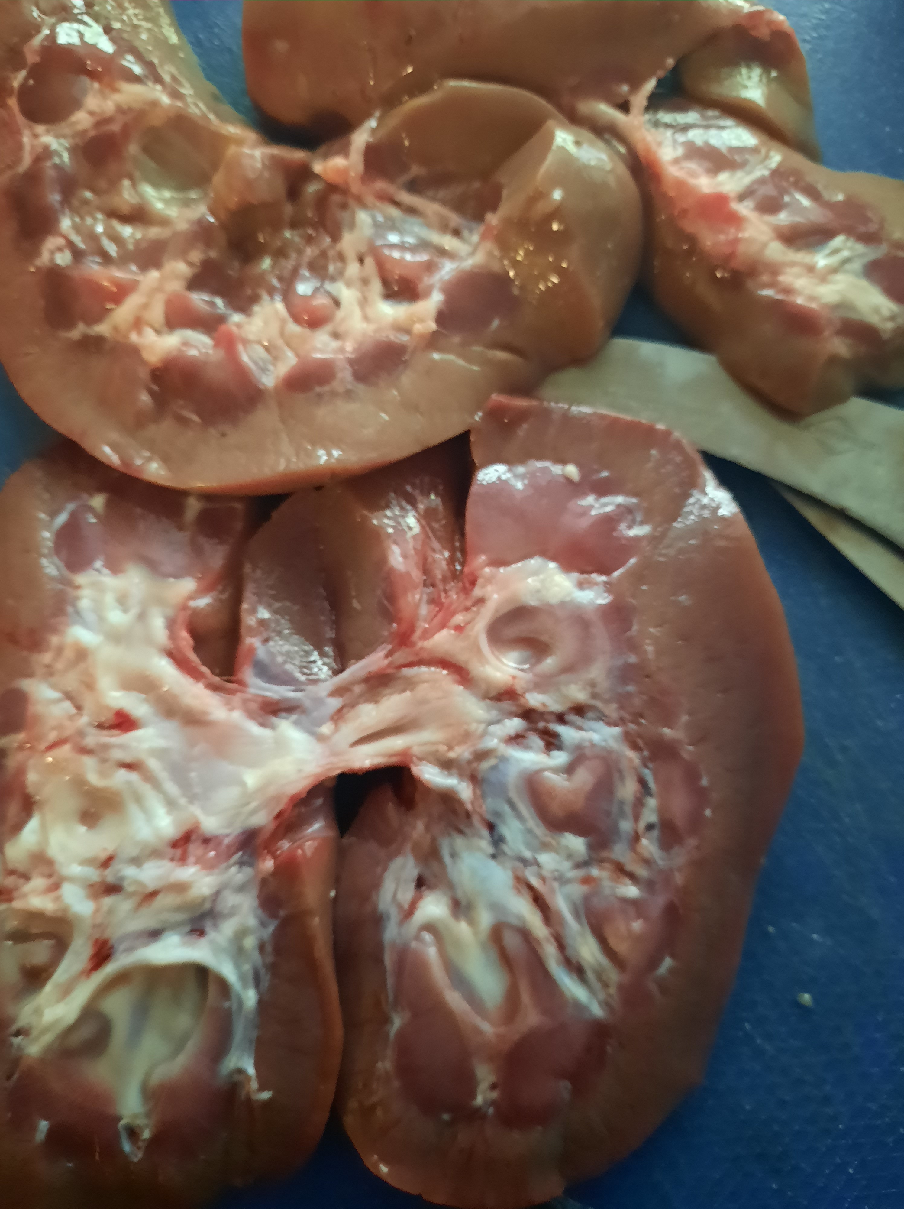 Puhasta neerud rasvast. Lõika neer pikuti pooleks ja puhasta seest kelmest ja rasvast. (mina kasutasin juba puhastatud põrsa neere, sest pühapäeval on meie lihuniku pood kinni kust võiks saada korralkke puhastamata vasikaneere) Vaata videost!