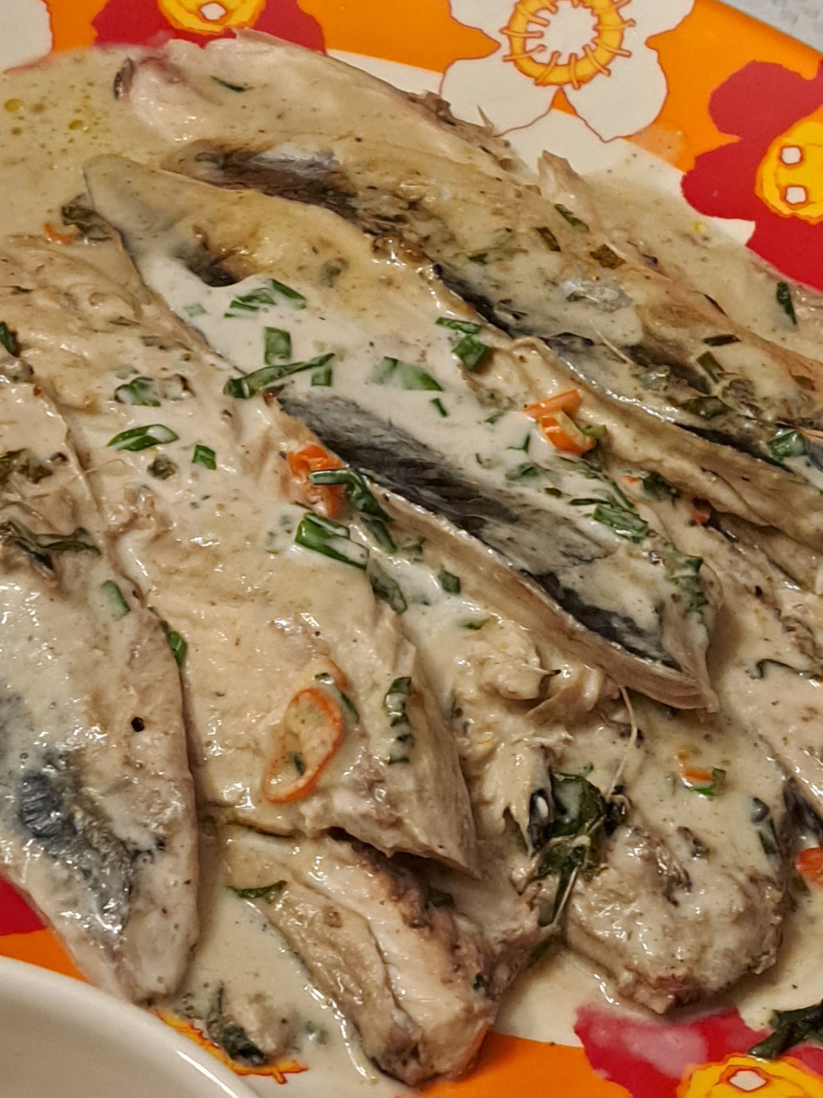 Pigista laimidest mahl ja pane makrellid mahla sisse marineeruma umbes 2 tunniks. Sega suures kausis kokku kookospiim, punane sibul, hakitud tšilli ürdid ja lisa soola-pipart maitse järgi ja aseta laimimahlast võetud makrellid kookospiima marinaadi ning hoia neid seal umbes 1 tund. Prae makrelle väheses õlis mõlemilt poolt umbes 2 minutit, tõsta taldrikule ja eemalda luud. Seejärel soenda kookosmarinaadi, kuid ära lase keema ning kalla makrellidele peale! Serveeri riisiga! Meie küll riisi kõrvale ei söönud, ajasime saiatükiga kastet taga. Kookosmaitset tunneb väga õrnalt, see absoluutselt ei häiri, mu eelarvamused olid asjata- oli üks äraütlemata mõnus laimine ja värskendav roog!